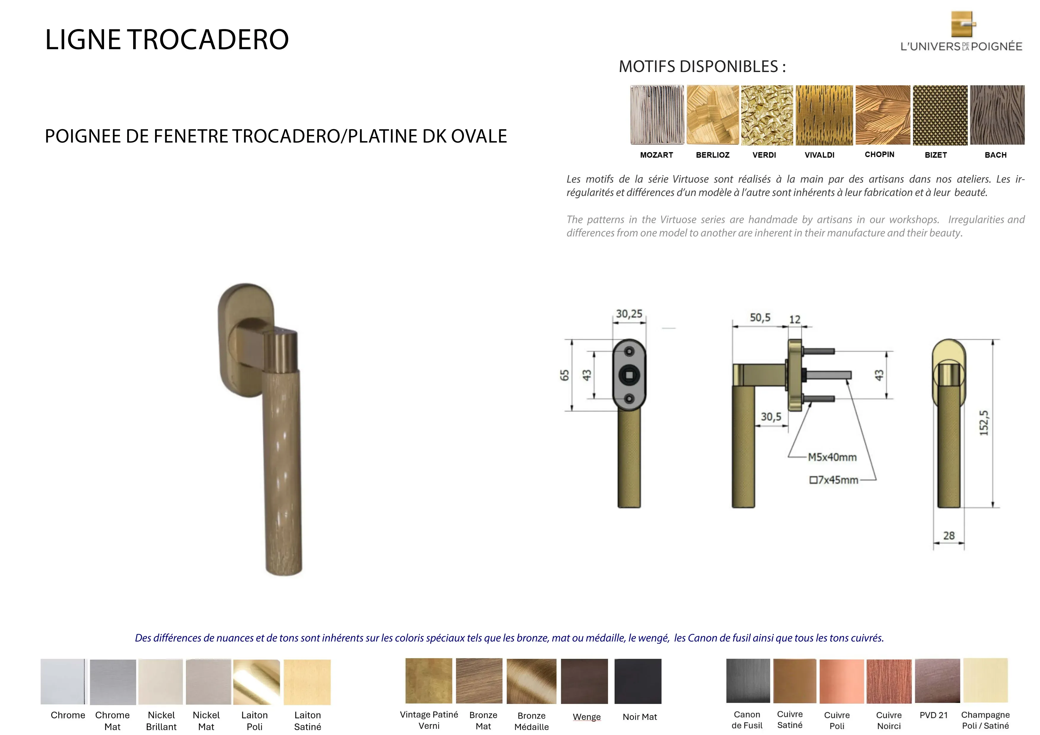 Des différences de nuances et de tons sont inhérents sur les coloris spéciaux tels que les bronze, mat ou médaille, le Wengé, les Canon de fusil ainsi que tous les tons cuivrés.